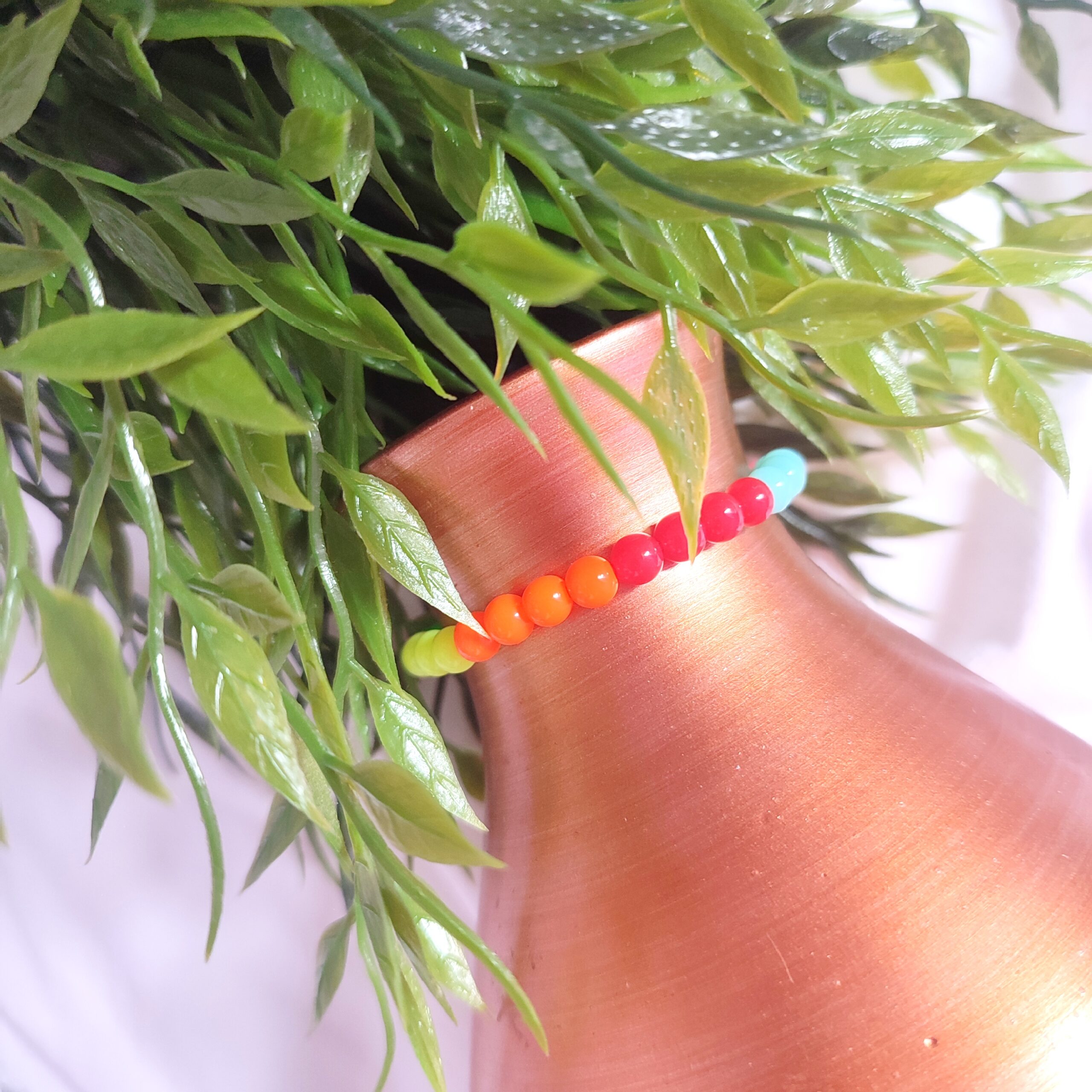 This colorful beaded bracelet is a fun and playful accessory. The variety of colors creates a vibrant and eye-catching look. The beads are strung together on an elastic band for a comfortable and easy fit.